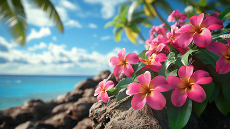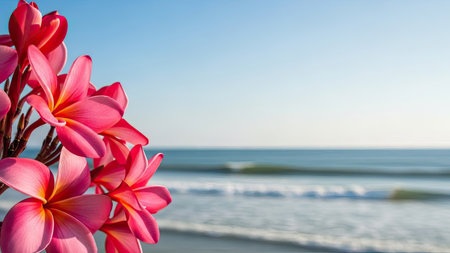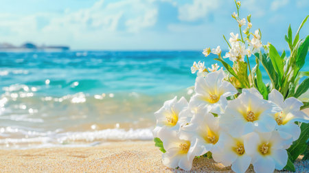 White and pink plumeria frangipani flowers on sandy beach in front of sea coast. Tropical exotic view. Travel vacation concept. Free copy space.