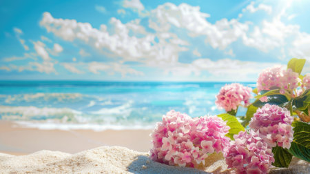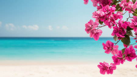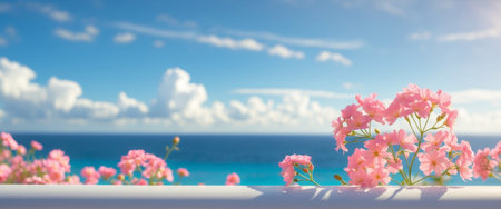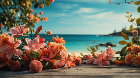 Incomparable beauty of flowers against the turquoise sea. Relaxing landscape for background. Selective focus-Vertical
