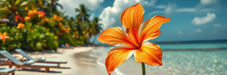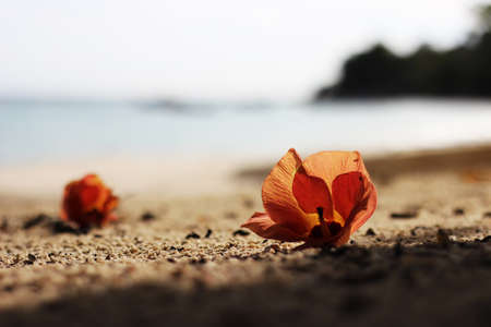 orange flower lies on the sand of Kata Phuket beach, Thailand