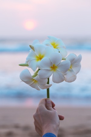 A bouquet of Champa flowers that grow on the beach. Plumeria flower on beach with sea and sky in background.​ Plumeria​ branches​ with​ a​ few flower​ are​ pick​ up​ on​ to​ the​ sky. Selective focus.