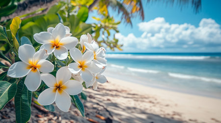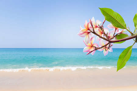 Plumeria flower over tropical beach background, summer holiday, tropical island, relaxing by the sea