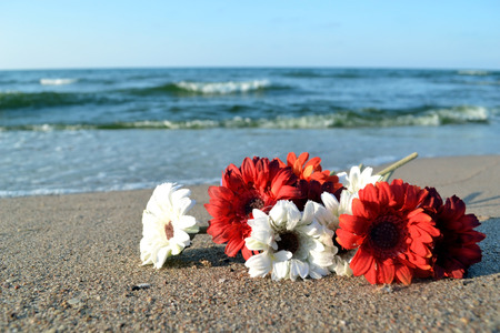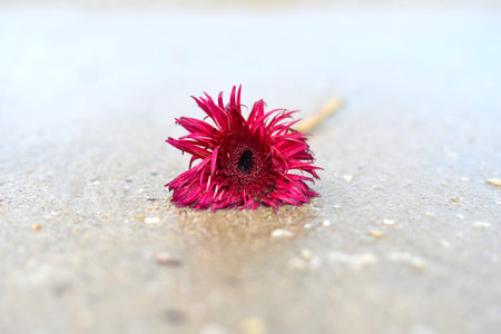Flower of mini gerbera Punki Arthur on the sand near the South China sea in Vietnam