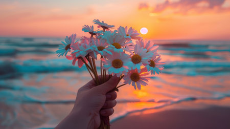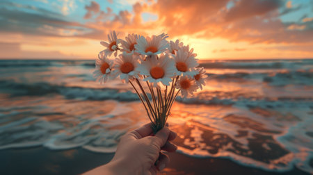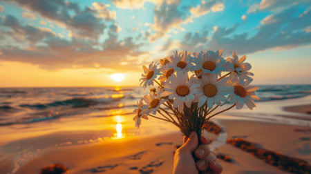 A stunning display of white roses rests gently on the sandy beach, illuminated by the soft glow of the sunset, creating a serene and romantic moment.