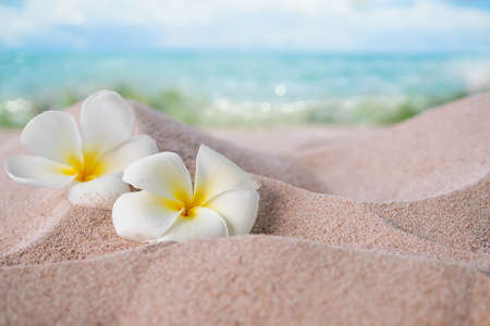 Aromatherapy spa concept. Plumeria flowers on sand beach at coast on blur blue sea and blue sky.