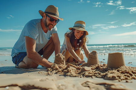 Smiling Couple Building Sandcastles on Sunny Beach Day in Summer