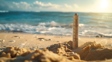 Close-up of thermometer stuck in beach sand with warm ocean background. The sun is shining indicating a warm temperature perfect for beach vacation weather.