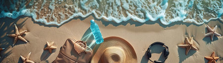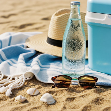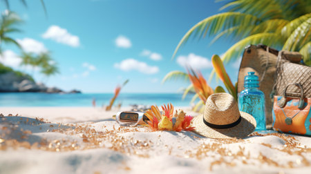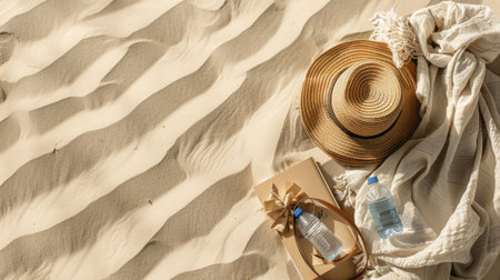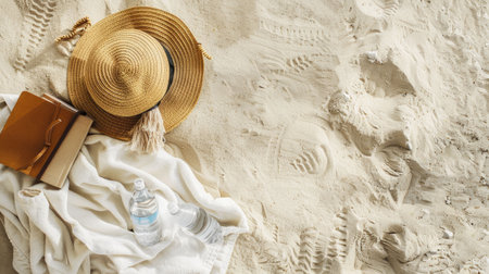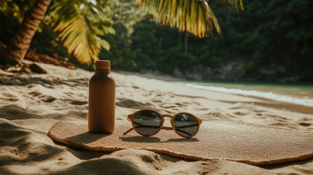 On the sandy beach rests a hat, sunglasses, a book, and a water bottle. The liquid inside glistens under the sun, creating a scene of leisure and relaxation AIG50