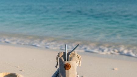 A panoramic, ultrawide environmental shot (16:9) featuring a reusable metal straw set contained with