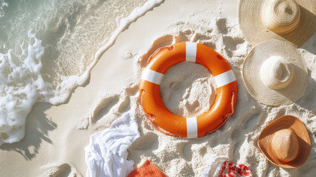 A colorful summer beach scene featuring a lifebuoy and stylish sun hats resting on soft sand, with gentle waves in the background, creating a serene atmosphere.