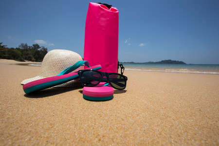 Tropical beach with sunbathing accessories, sunglasses, summer holiday concept background