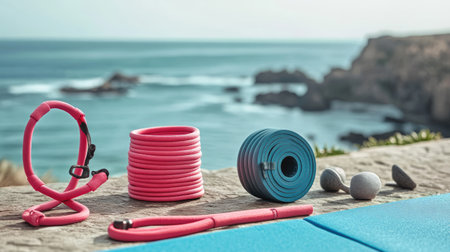 A vibrant scene featuring fitness equipment like dumbbells and a rope on sandy beach, with a stunning ocean view in the background, perfect for inspiring a healthy lifestyle.