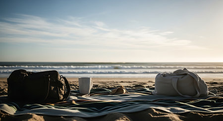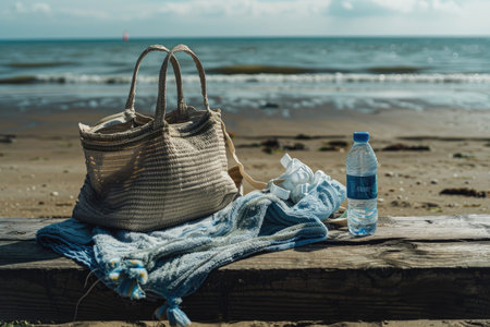 Serenity by the Shore: Water Bottle and Bag Resting on Beach
