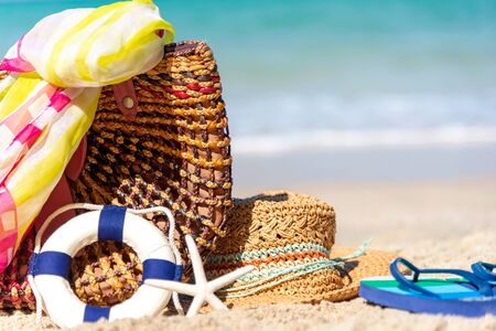Summer women's beach accessories for your sea holiday: straw hat, sunglasses, beach bag and striped towel, seashell.