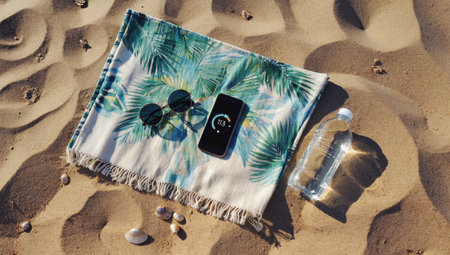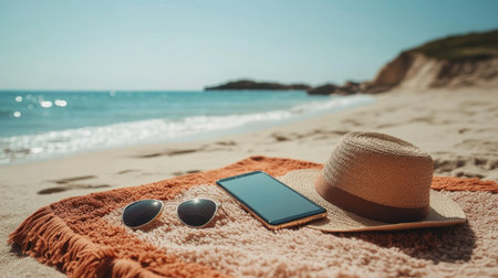 A tranquil beach setting featuring a smartphone, sunglasses, and a straw hat on a towel by the soothing waves, perfect for relaxing and enjoying a peaceful summer day.