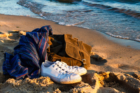 Background. Rustic leather backpack, blue sweatshirt and white sneakers on a sandy beach. Travel and vacation concept. Baltic Sea, Poland.