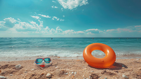 Relaxing Beach Day with Orange Inflatable Ring and Snorkeling Gear on Sunny Shoreline