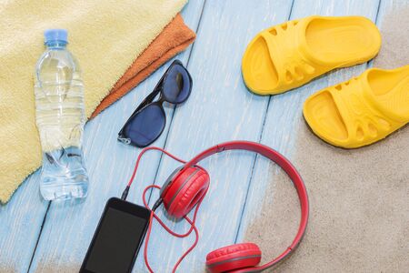 Relaxing beach towel with sunglasses, smartphone and water on sand