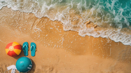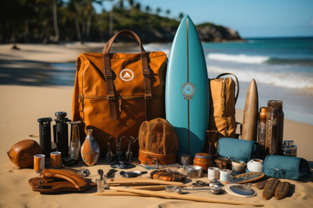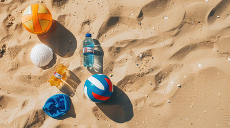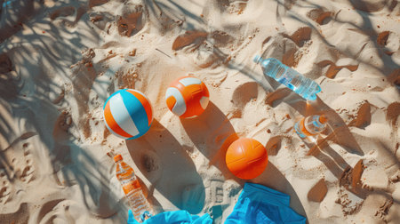 Bunch of items that are laying out in the sand on the beach. Generative AI.