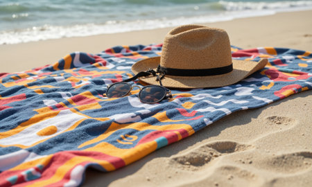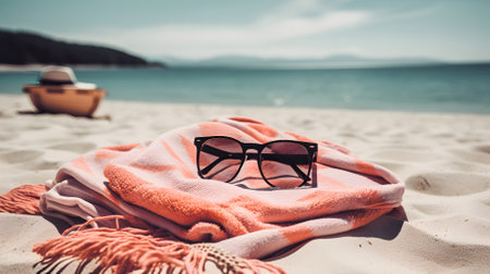 summer vacation scene on sunny sand beach with towel and sunglasses, neural network generated art