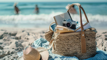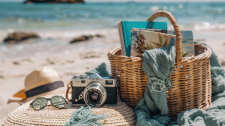 A waterresistant wicker basket packed with a hat, camera, and books rests on the sandy beach, blending wood, fashion accessories, and art into the coastal landscape AIG50