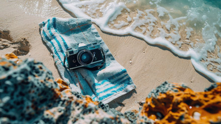 A camera is placed on a blanket at the beach, with the camera lens pointing towards the sea. It appears to be a digital camera, possibly a pointandshoot or mirrorless interchangeablelens camera AIG50