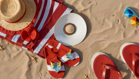 A beach scene with a red and white striped towel, a straw hat, and a pair of red flip flops