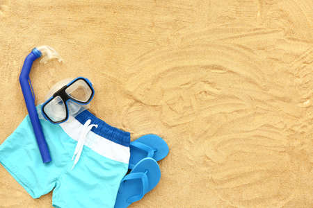 Scuba mask on sandy beach. Outdoor lifestyle concept. Nobody