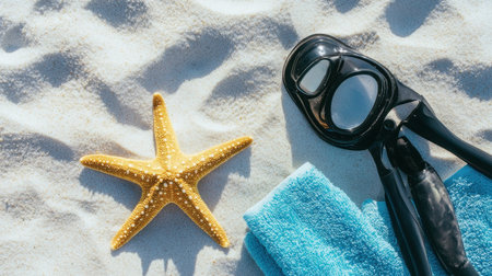A vibrant summer beach scene featuring a yellow starfish beside snorkeling gear and a blue towel on soft sand, ideal for travel and nature themes. Perfect for adventure imagery.
