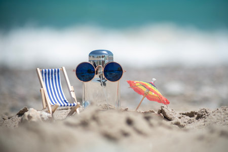 Concept of tourist VACATION on the beach with a bottle of perfume, vacation