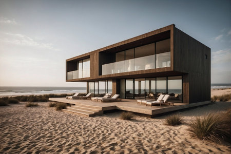 Small House on the Ocean Shore. Dark Brown Interior with Large Windows. Promotional shot of beach tourism