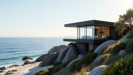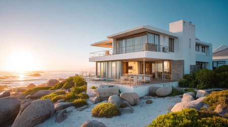 Overlooking a serene ocean, a sleek beachfront residence blends seamlessly into the rocky terrain. The sun sets, casting a warm glow on the modern architecture surrounded by lush greenery.