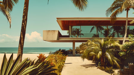 Beautiful view of luxury house on tropical beach with palm trees and turquoise water
