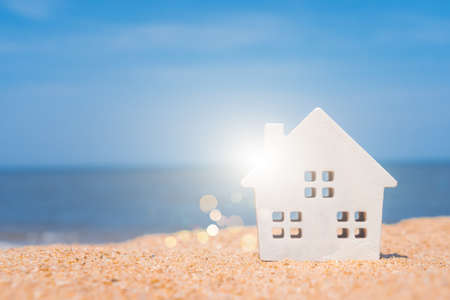Small home model on sand beach with blue sky and white clouds background. Copy space of family lifestyle and business real estate concept. Vintage tone filter effect color style.
