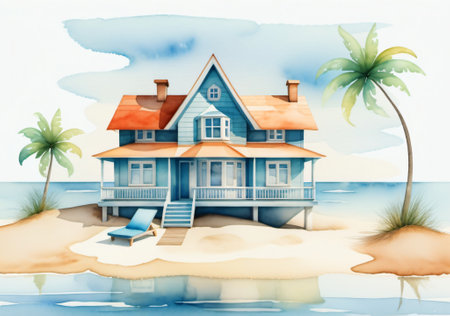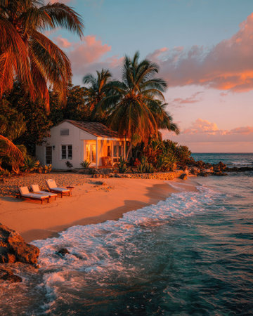 A house stands near a beach with palm trees and ocean. The scene is bathed in warm sunset colors. The composition includes sand, waves, and sky. This image is suitable for various commercial uses, including travel, real estate, and lifestyle content. It avoids any specific place names.