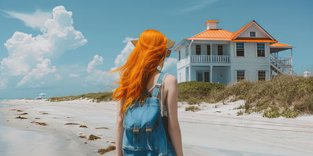 Young red-haired girl in a denim dress on the background of a beautiful house on the beach