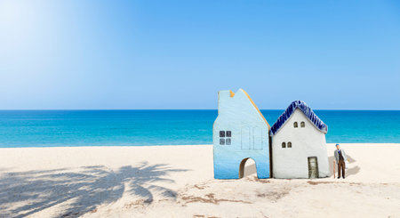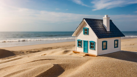 A charming miniature house with blue windows and door rests on a sandy beach, set against a calm ocean backdrop and a clear blue sky, depicting a peaceful coastal setting. AI generated image