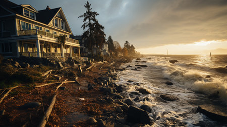 a photo of a coastal village experiencing sea-level rise and erosion during a storm