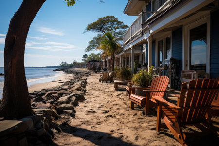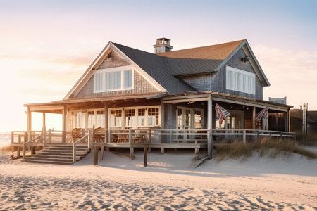 cape cod house, with view of the beach and ocean, on a warm sunny day, created with generative ai