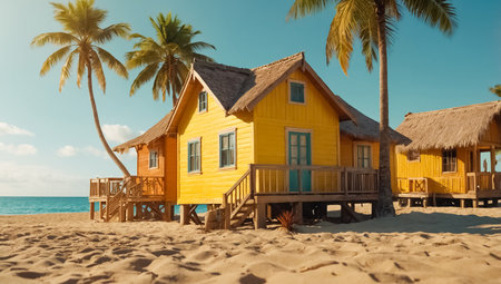 Tropical beach with yellow bungalows and palm trees in Cuba
