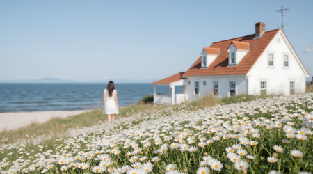 A small cottage sits atop a grassy hill overlooking the ocean. The building features a red tiled roof and light-colored walls. The image showcases a natural outdoor setting, with soft lighting and a calming color palette. Suitable for various editorial and commercial projects.