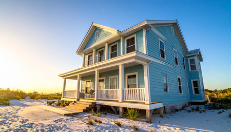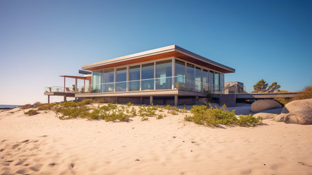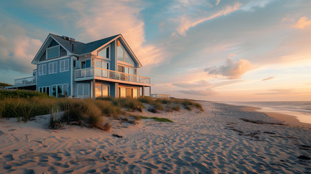 This tranquil scene captures a beach cottage overlooking the vast ocean. Soft sunlight illuminates the sandy beach and the gentle waves. The composition focuses on natural elements, featuring a clear sky and beach grass. It could be used for travel, tourism, or lifestyle content.