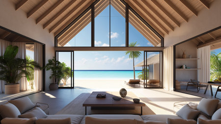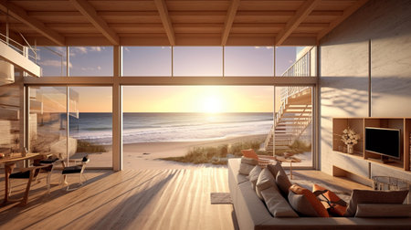 Coastal retreat interior with ocean view and rustic decor. That the image is generated using AI.