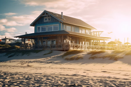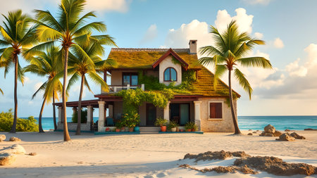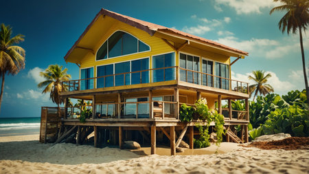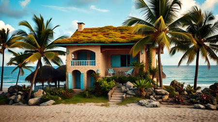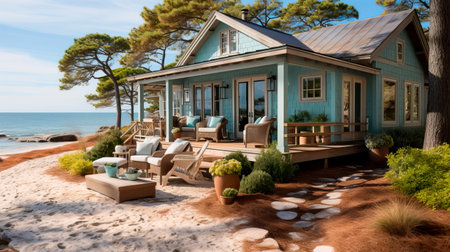 A quaint beach house surrounded by nature and ocean waves, ideal for relaxation. AI generated image