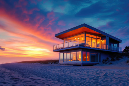 A beautiful house sits majestically on top of a sandy beach, offering breathtaking ocean vistas, A modern beach house during a vibrant sunset, AI Generated