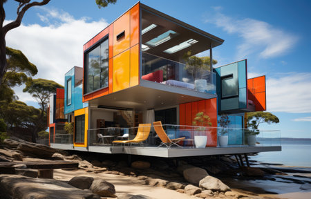 A modern beach house built with wood and blue materials generated by artificial intelligence
