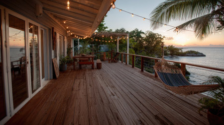 An outdoor wooden deck features a hammock and railing with a view of the ocean. The deck is lit by string lights, with trees and a building visible in the background. Warm colors and sunlight create a relaxed atmosphere, suitable for various uses including lifestyle and travel themes.