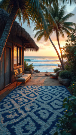 Tropical beachfront bungalow at sunset with palm trees and ocean view. That the image is generated using AI.