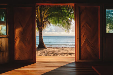 An open doorway offers a view of a beach scene. Soft sunlight bathes the sandy area. The frame highlights the azure water, distant mountains, and coastal flora. The aesthetic presents potential for travel, relaxation, or lifestyle imagery in various commercial and editorial projects.