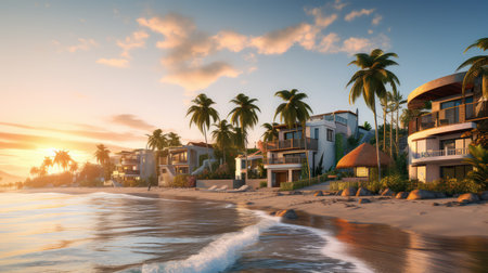 A house stands near a beach with palm trees and ocean. The scene is bathed in warm sunset colors. The composition includes sand, waves, and sky. This image is suitable for various commercial uses, including travel, real estate, and lifestyle content. It avoids any specific place names.