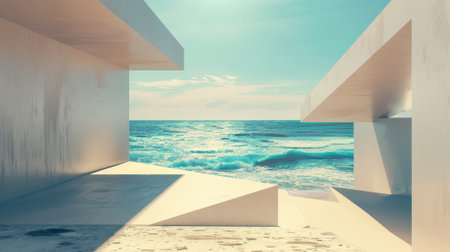 Landscape scene with geometric form. Ocean beach view. 3D rendering..